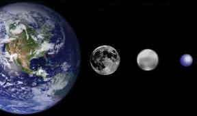 BIG FIND. Quaoar (far right), a newfound giant in the Kuiper belt, alongside (left to right) Earth, Earth’s moon, and Pluto.