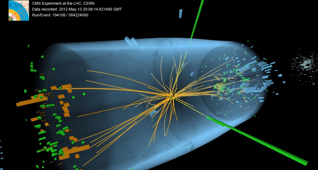 BIG BANG This CMS collision event shows characteristics expected from the decay of the standard model Higgs boson to a pair of photons (dashed yellow lines and green towers). The prediction of the Higgs particle won scientists the Nobel Prize in physics.