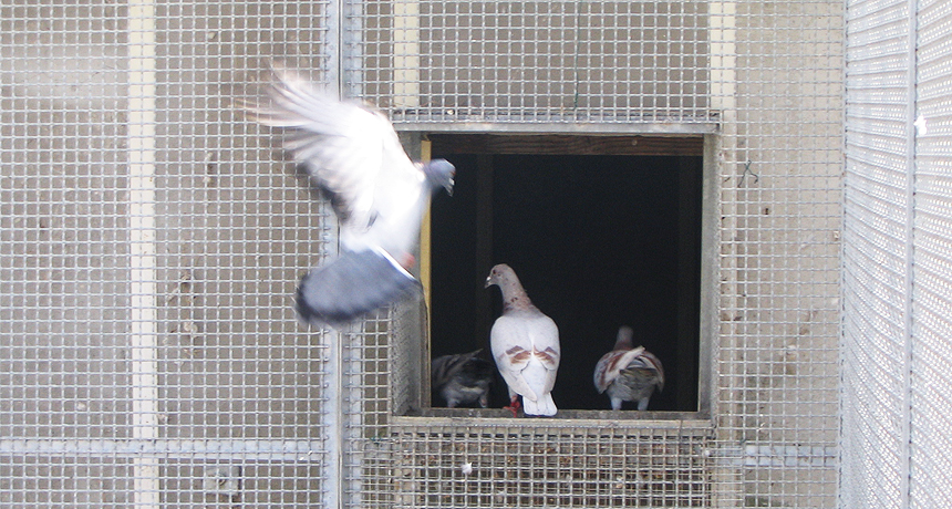 FLYING ON AUTOPILOT Like automatons, homing pigeons without hippocampi fly straight toward home early in their journey, a new study finds.