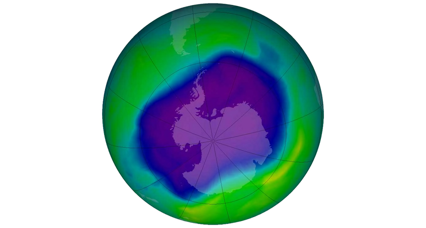 SHRINKING HOLE The ozone hole over Antarctica reached its largest extent in 2006 (purple and blue indicate depleted ozone) before starting to shrink. The international treaty intended to reduce the ozone hole has had a cooling effect on Earth’s climate, a study finds.