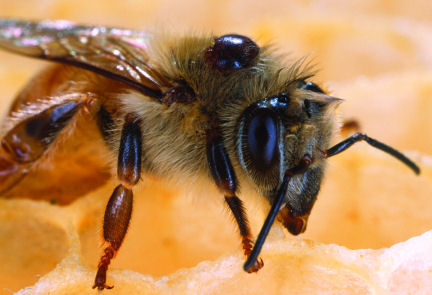 CARRIER? U.S. honeybees have been plagued by the varroa mite (dark, rounded parasite on this bee’s back) which spreads and aggravates diseases, possibly including Israeli acute paralysis.
