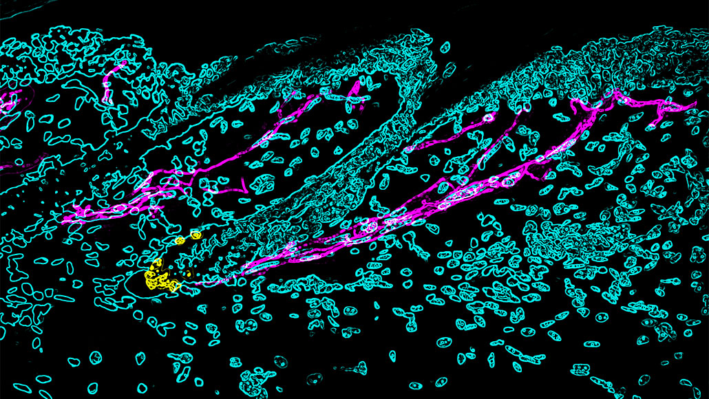 A new study finds that stress turns hair gray when nerves in the sympathetic nervous system (pink) activate and deplete a hair follicle’s melanocyte stem cells (yellow), which give hair its color. Teal marks the cells’ nuclei.