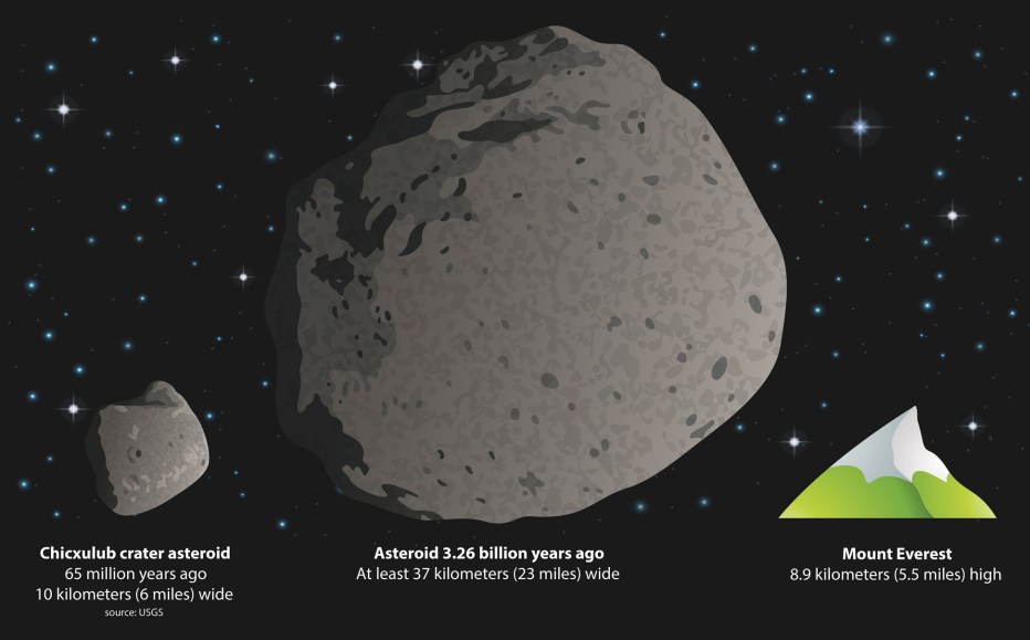 SPACE ROCKS The size of the asteroid that may have killed the dinosaurs (Chicxulub) and even Mount Everest look tiny compared to a space rock that may have slammed into Earth 3.26 billion years ago.