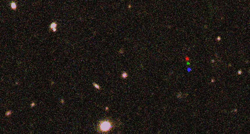 WANDERING WORLD The newly discovered planetoid, 2012 VP113, moves against a backdrop of stars in these pictures taken at the Cerro Tololo Inter-American Observatory in Chile. This photo combines three images taken a couple of hours apart. The individual images of 2012 VP113 are colored red, green and blue. It moved two-thousandths of a degree across the sky between the first and last image.
