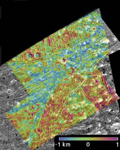 The images bring three-dimensional relief to a panoply of fractures, faults, and grooved terrain. They reveal that the smoothest, brightest swaths lie in troughs 0.5 to 1 kilometer or so lower than the most heavily cratered areas. Moreover, depressions resembling volcanic calderas lie at the edges of the swaths.