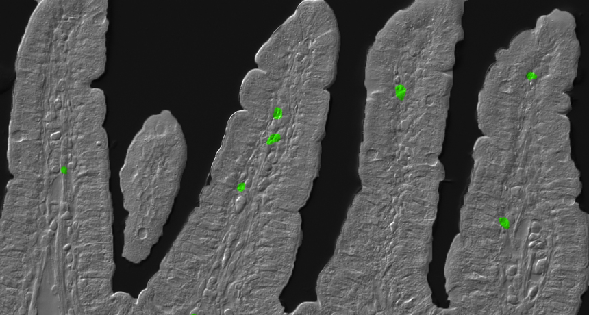 UPSET CLOCK Disrupting a mouse’s internal clock boosts the abundance of one type of immune cell, TH17 (false-colored green), in the lining of the intestines (gray fingerlike projections). The extra immune cells may make animals prone to inflammatory diseases.