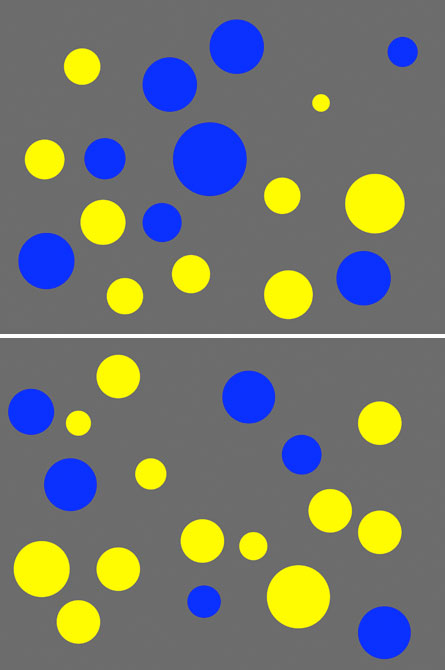 In Halberda’s study, 64 healthy 14-year-olds attending regular classes in public schools viewed arrays of blue and yellow dots on a computer screen. Each array appeared for a fraction of a second, making it impossible to count dots. The number of dots of each color varied from five to 16. Dots also varied in size to ensure that greater numbers of one color did not cover a larger total area than smaller numbers of the other color, thus giving away the more numerous set of dots.