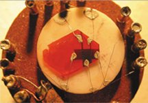 RED HOT. This prototype transistor on a pure crystal of the plastic semiconductor rubrene incorporates innovations expected to speed development of plastic electronics.