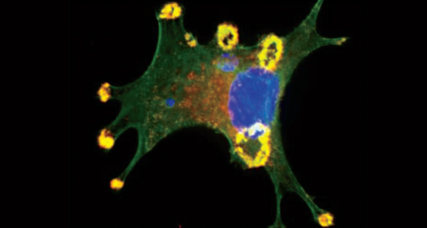 STEPPING OUT Invadopodia are footlike projections (yellow, on mouse cell) that bud from cancer cells and may help the cancer to invade neighboring tissues.