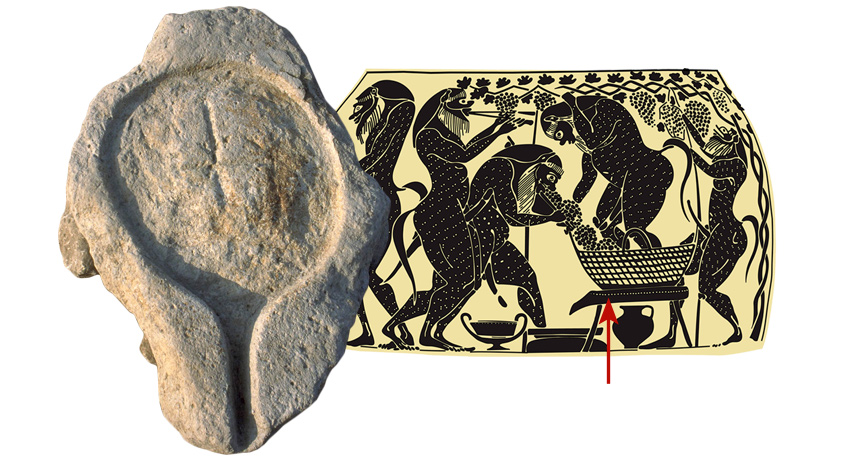 A limestone platform (left) from a site in southern France resembles one on a Greek vase (arrow) in a scene documenting the wine-making process.