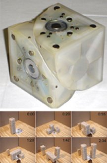 JUST LIKE ME. In frames from a video (bottom), a stack of modules of the type shown in the top image builds a duplicate stack.