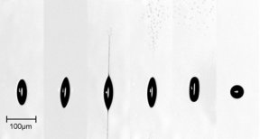 FREEZE FRAME. Six droplets, photographed at increasing time intervals after instability, show the development of Rayleigh jets (third image) and their disappearance.