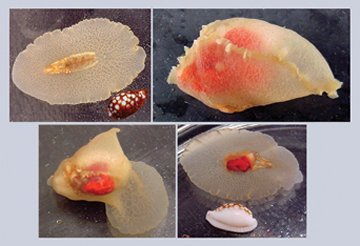 LUNCH DATE. A newly discovered flatworm from Guam wraps its body around a cowrie in its shell, paralyzes it with a nerve toxin, and pulls out the red body in about half an hour.