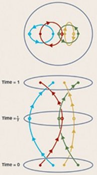 Imagine several anyons on a surface, and suppose they move around along complicated paths, ending up where they started. On the surface, the paths may cross each other in many spots. However, in space-time–in which there is one snapshot of the surface for each moment in time–the paths don’t pass directly through each other, but simply braid around each other.