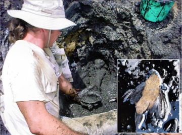 That mene, more than 1 km long and 500 meters wide, is at least 10 times the size of the tar pits at Rancho La Brea, says Orchard. Nevertheless, paleontologists have removed only about 1.5 cubic meters of sediment, or around 15 wheelbarrow loads, from the site. That fieldwork—which involved carefully digging down into the oily muck 10 centimeters at a time, screening the material, and then tallying the fossils—took place in the summer of 1998.