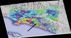 Map of the Los Angeles area shows land subsidence in summer of 1999. The largest drop, about 5.4 centimeters,