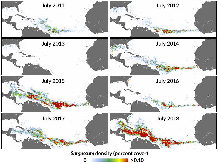 Sargassum algae growth in the Atlantic Ocean in July, 2011–2018