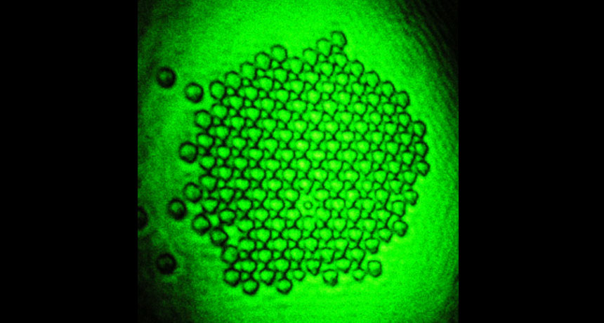 BUILT WITH LIGHT About 150 plastic beads arranged themselves into a micrometers-wide mirror when illuminated with green laser light.