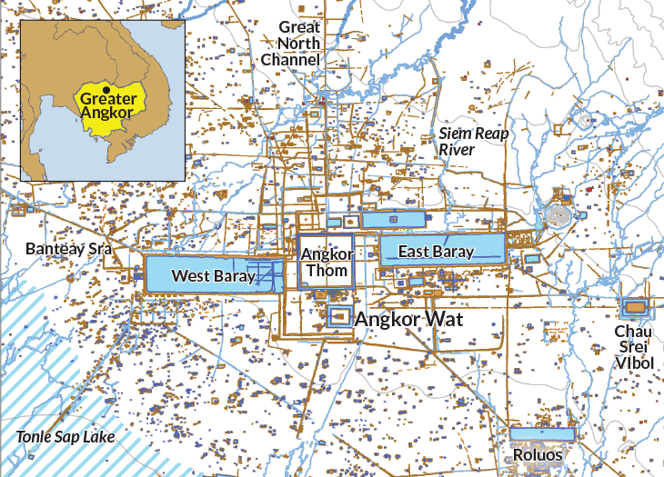 A map of Greater Angkor, based on radar and other conventional imaging techniques, shows the spread of this massive medieval city in northern part of Cambodia (inset, yellow). Reservoirs, shown as blue rectangles, were situated to the east and west of Angkor Wat and nearby temple Angkor Thom. Laser mapping of the area is expanding Greater Angkor’s reach even farther.