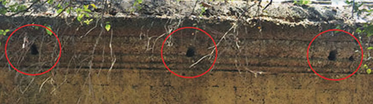 Brotherson studied 6,257 wall cavities. Most consist of groups of seven square holes, at the same height, running across the inside of the wall near its top. Sets of holes, notches and grooves also run across adjacent areas on top of the wall.