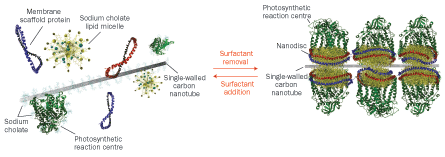COME TOGETHER | Future solar cells may build and repair themselves using a handful of ingredients: photosynthetic reaction centers (green) to capture light, carbon nanotubes (grey bar) to carry current and nanodiscs of lipids (yellow) and proteins (red and blue) for structural support.