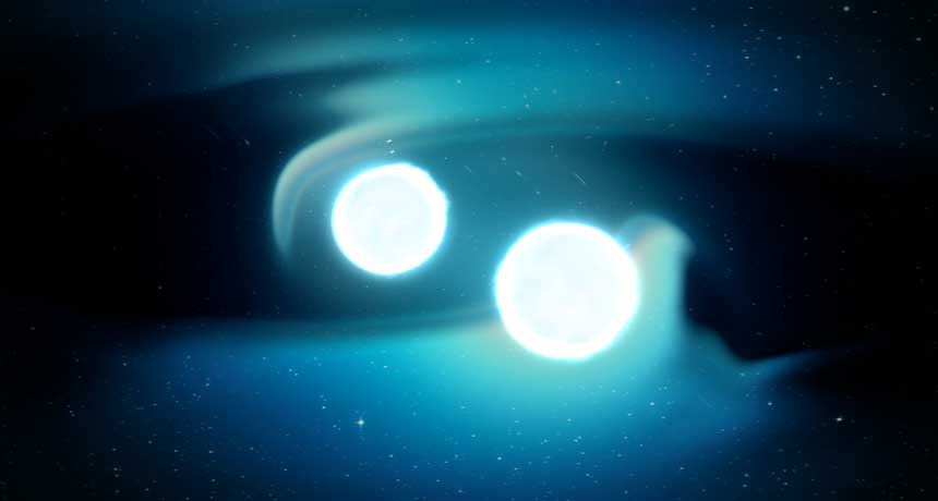 BANG, CRASH Physicists using the LIGO and Virgo observatories are catching all sorts of cosmic collisions, including of pairs of neutron stars (illustrated). But scientists hope to bag even more exotic quarry.