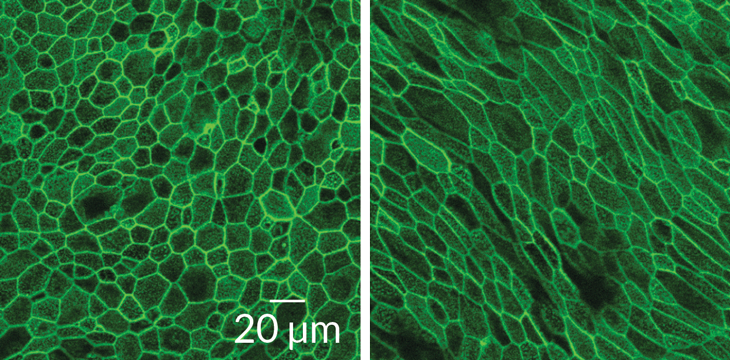 Human airway epithelial cells (stained green) in normal tissue (left) are “jammed,” that is, they act more solidlike. But when mechanically compressed to mimic airway narrowing during an asthma attack, the cells become elongated and can flow (right).