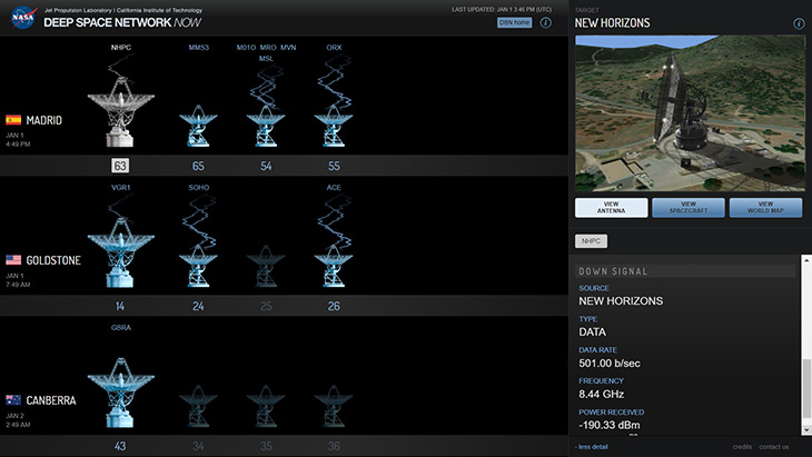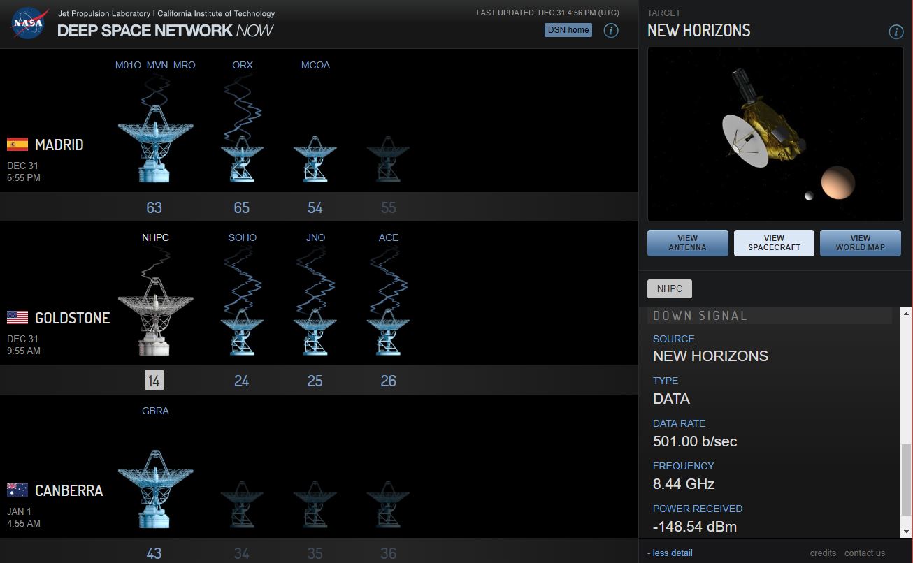 NASA’s Deep Space Network of radio telescopes spends most of its time listening to spacecraft. It will receive New Horizons’ all-clear signal tomorrow morning, after the flyby. But nearly two hours ago, two of the DSN’s telescopes — Goldstone in California and Canberra in Australia — sent a signal to New Horizons. At about 6:15 p.m. Eastern time, the telescopes beamed a strong radio signal at Ultima Thule.