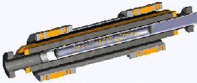 Beam (not shown) from left sheds neutrons (yellow dots) in magnet-shrouded trapping chamber (hollow blue pipe). Decays there ionize helium, causing flashes that indicate neutron lifetime. Huffman et al./Nature