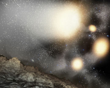 SMASH! Four giant galaxies in the cluster CL0958+4702 are ramming into each other in this artist’s simulation rendered from the vantage point of a nearby, hypothetical planet.