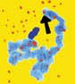Overlaid microscope images show zigzag path (light blue, starts at arrow) of tin island (dark blue), dropping bronze spots (red) on copper (yellow). Schmid, et al./Science