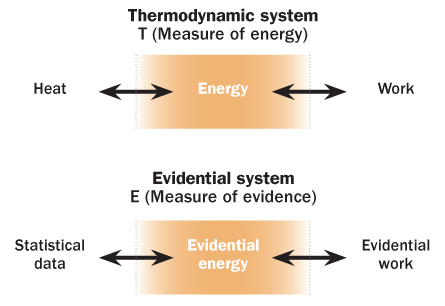 EVIDENCE ANALOG Heat flowing into a thermodynamic system (top) provides energy that can be converted to work. Temperature offers an absolute measure of the system’s energy. An analogous system (bottom) might provide a consistent way to measure strength of evidence provided by statistical data.