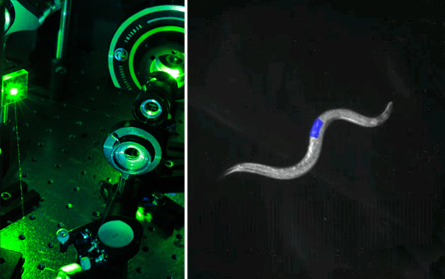 HOW THE WORM TURNS A laser system (left) controls the behavior of worms by commandeering nerve cells using light (right). Leifer et al/Nature Methods 2011