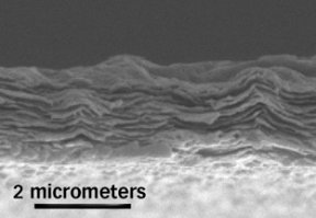 STRONG AND BEAUTIFUL. A scanning electron micrograph reveals layers in a mother-of-pearl imitator. Z. Tang, Oklahoma State University/NSF