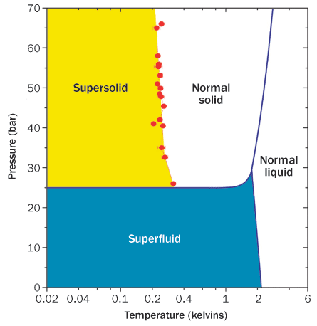 In the phenomenon known as supersolidity, solid helium flows through itself. Shane L. JohnsonSUPER HELIUM Under normal conditions, helium-4 is a gas, but at temperatures close to absolute zero it can exist in other phases.