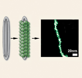 In more recent work, reported in the May 2 Advanced Materials, Belcher’s group demonstrates a method to attach viruses to a wide variety of organic and inorganic substances, including gold nanoparticles and fluorescent dye molecules. The viruses with their attachments then assemble into fluid, yet well-organized, two- or three-dimensional structures.