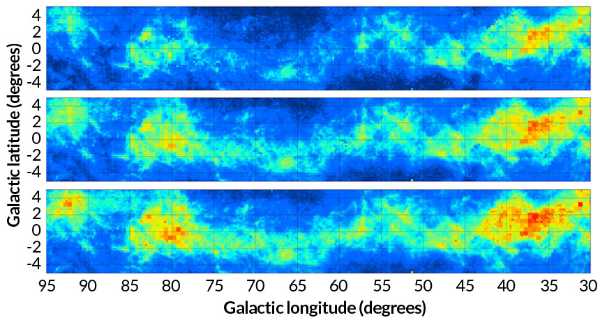 COSMIC DUST BUNNIES A 3-D map of the plane of the Milky Way shows where dust accumulates (red is the most dust, blue the least). From top to bottom, each panel extends another roughly 3,300 light-years from Earth.
