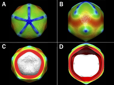 Mimivirus, the largest known virus, bears a starfish-shaped structure (A and B) that covers an opening in the virus coat through which DNA might be expelled when infecting a host.