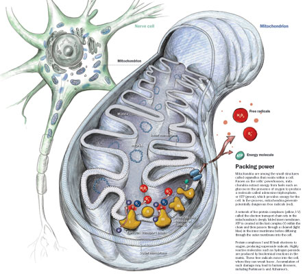 Free radical damage has long been suspected as a culprit in aging, and mitochondria are both the primary source of free radicals in a cell and the main protection against them. “As you get older, the number of mitochondria that are not functioning increases,” says Mark Mattson, chief of the National Institute on Aging’s Laboratory of Neurosciences in Baltimore. Over time, mutations accumulate in mitochondrial genes. These and other changes may cause the power plants to work less efficiently, producing less energy for the same amount of glucose — the way a less energy-efficient car travels fewer miles on a tank of gas. Cells eventually become less able to rid themselves of these defective mitochondria. As life goes on, the body moves closer to a brownout — or so says the mitochondrial aging theory.