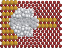 STEP TRAINING. Seen from above, a molecular mold (gray) organizes top-layer copper atoms (yellow) into a two-atom-wide protrusion.