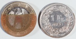 ITCHING FOR MONEY. A 1-euro coin (left) corrodes after partial submergence in artificial sweat, although a nickel-rich 1-franc Swiss coin (right) does not. Dept. of Dermatology/Univ. of Zurich and Inst.