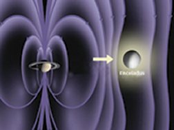 MOON VAPORS. Atmosphere on Saturn’s moon Enceladus deflects the planet’s magnetic field, as depicted by an artist.