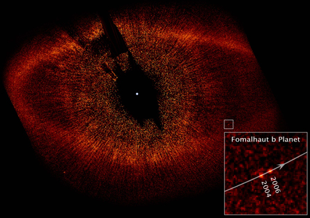 The Hubble space telescope imaged the Fomalhaut system, its large dusty debris ring and a probable planet (box).