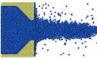 Propane molecules (blue) squeeze through a gold nozzle some 20 molecular diameters wide. Some molecules stick to the nozzle or boil away but most shoot off as a liquid jet. Moseler and Landman /Science
