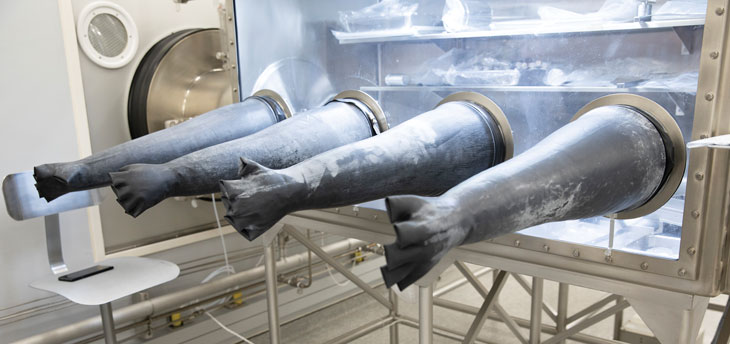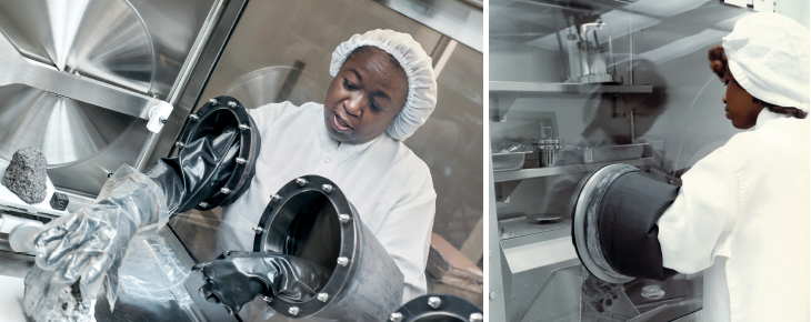 Inside the clean room, I face another barrier: The rocks are stored in secure, pressurized cabinets — like big terrariums — filled with pure nitrogen. The only way to reach the samples is by sticking already-gloved hands into another set of gloves that wave from the cabinets like zombie arms.
