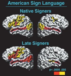 Newman’s group used functional magnetic resonance imaging to compare blood flow in volunteers’ brains as they read English sentences and random strings of consonants, and as they watched the presentation of sentences and nonsense signs in American Sign Language. Only those who learned sign language as children showed increased blood flow in the right angular gyrus.