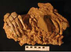 CAVE FINDS. A block of sand and clay from El Sidrón cave in Spain holds Neandertal foot bones (left) and ribs and a backbone (right).