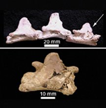 TASTES LIKE CHICKEN? The tip of a spinosaur tooth (arrow in top image and detailed below) embedded in a pterosaur neck bone indicates that spinosaurs occasionally preyed upon or scavenged the remains of flying reptiles.