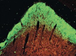 REPAIR POTENTIAL. Severed nerve cells showed new growth (green) in brain tissue of hamsters treated with a nanotech chemical.