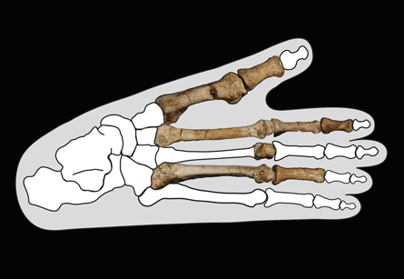 FOOTLOOSE HOMINID Eight toe bones (shown in the outline of a gorilla foot) found in Ethiopia belonged to a 3.4
